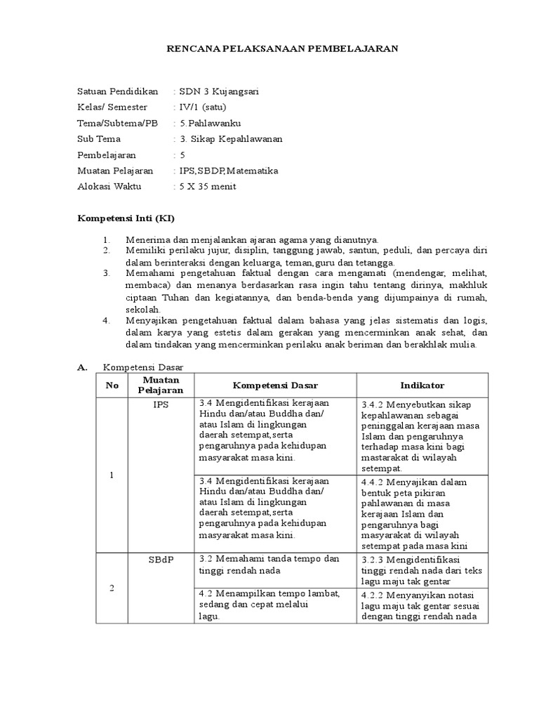 Rencana pelaksanaan pembelajaran kurikulum 2013 kelas iv tema 5 pahlawanku sub tema 3:
